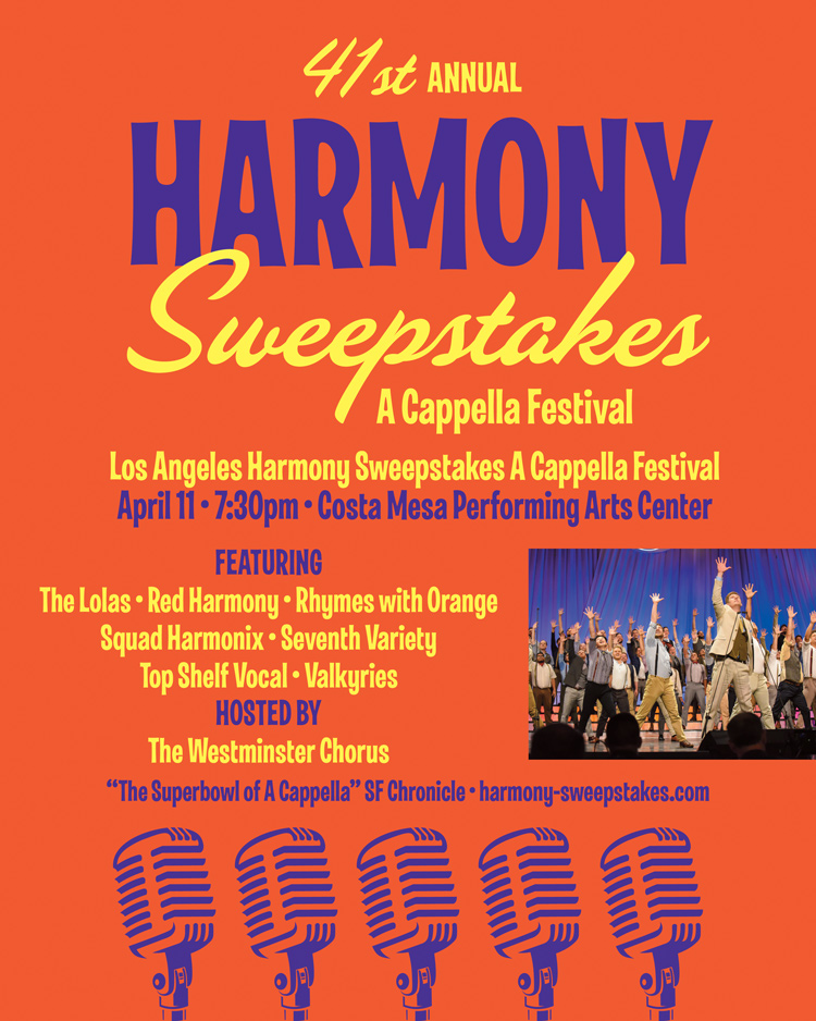Recordings | Groups | Goals | Rules | How to enter | Contact Us | About Us | Publicity Photos Boston | Chicago | Los Angeles | New York | Rocky Mountain | Pacific North West | San Francisco | Mid Atlantic (DC)The Harmony Sweepstakes A Cappella Festival is the premier American showcase for vocal harmony music. The annual national competition draws from hundreds of vocal groups from around the country with regional competitions in eight cities. The winning group from each festival is flown to perform in front of celebrity judges and a sold out house of enthusiastic a cappella fans at the National Finals. |